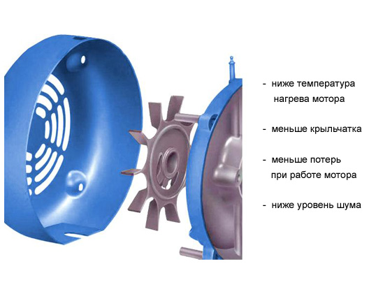 Одно из важных преимуществ нового энергоэффективного двигателя – сниженный уровень шума. В электродвигателях класса IE2 использованы не столь мощные и более тихие вентиляторы, что также играет роль в улучшении аэродинамических свойств и снижении вентиляционных потерь.